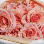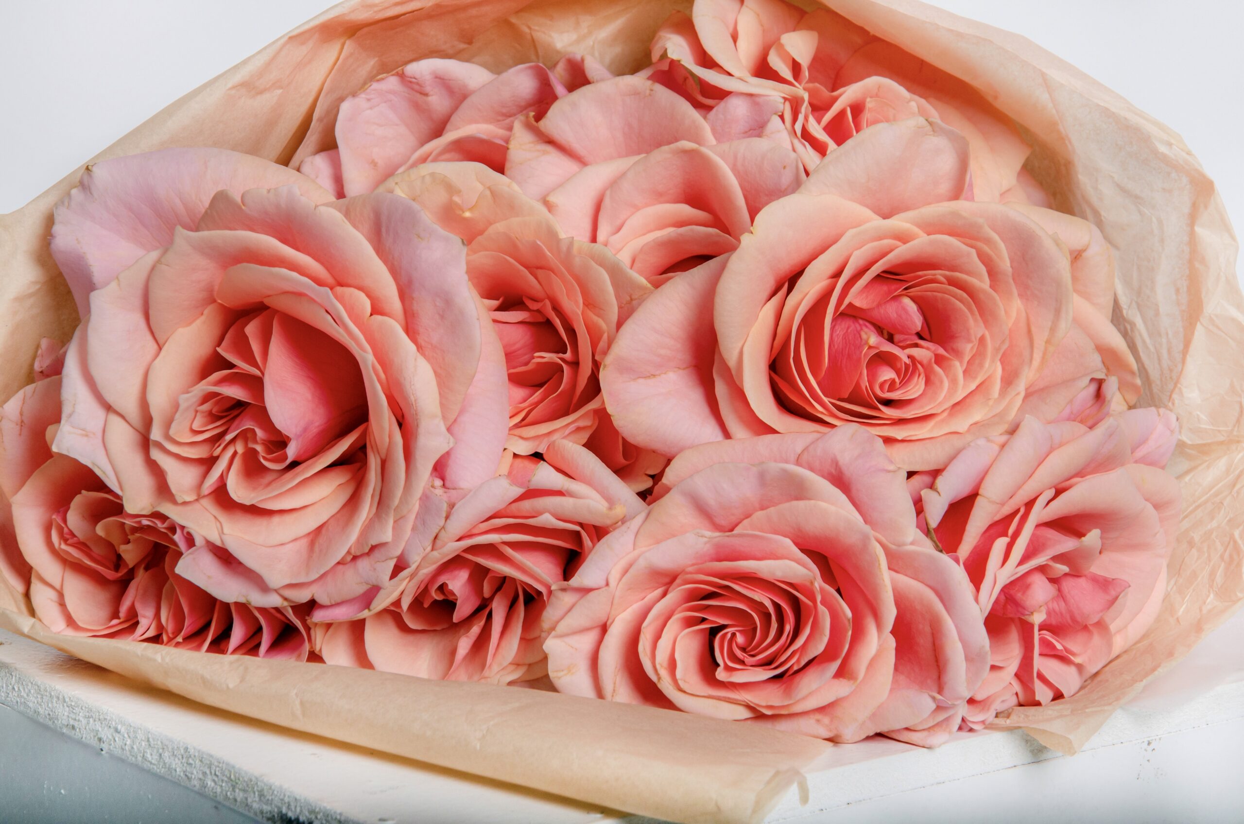 Evangeline es un bouquet de rosas de jardín bicolor: pétalos amplios y sedosos, con un degradé suave entre durazno, blush y un toque coral en el borde.