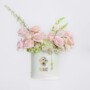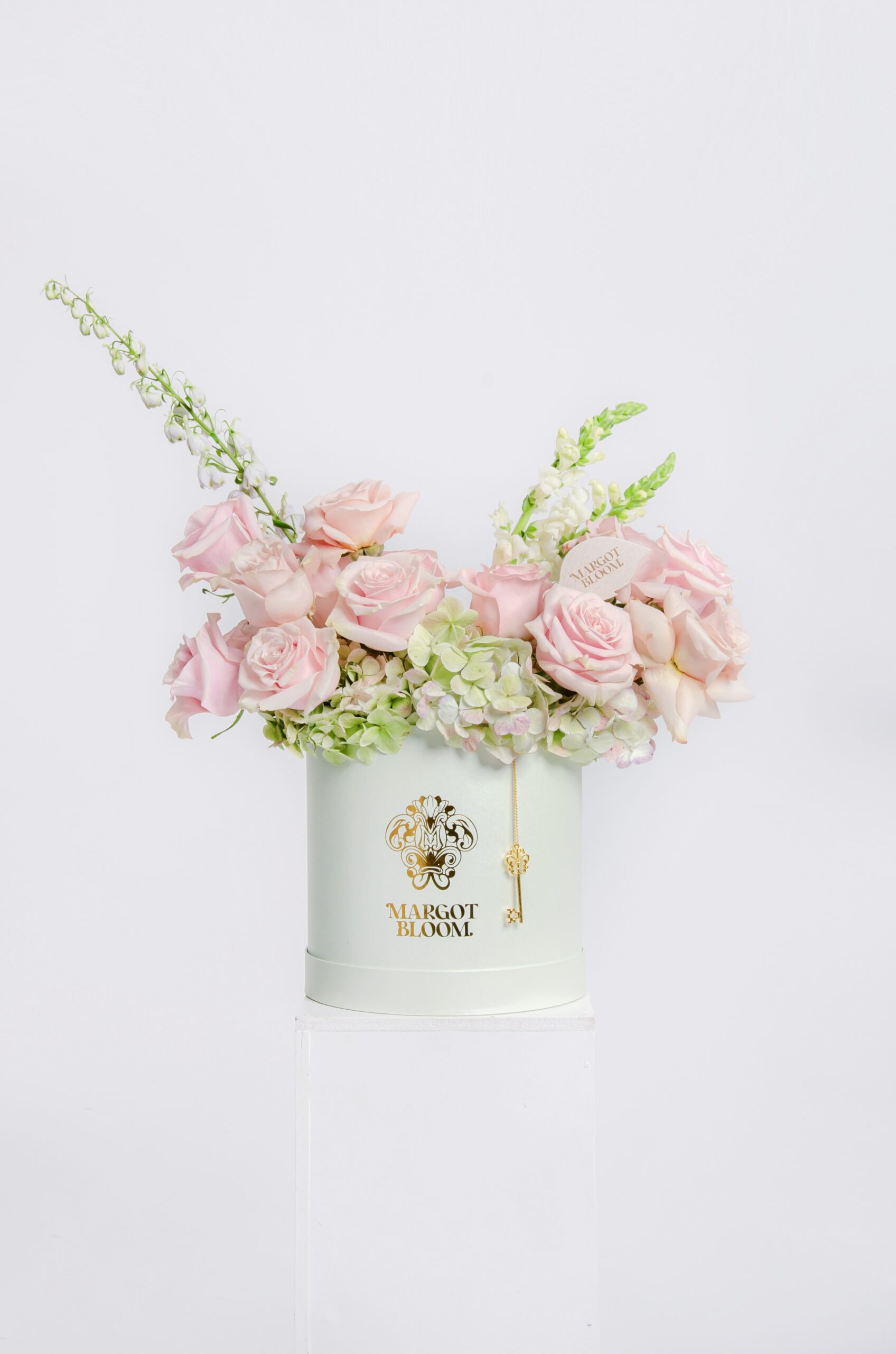 Su composición reúne hortensias verdes, atravesadas por matices rosados y malva que revelan una belleza en transformación; rosas en un rosa empolvado, serenas y envolventes, que evocan ternura, calma y feminidad; bocas de dragón etéreas y estilizadas, que aportan movimiento; y sutiles toques de delphinium, que suavizan el conjunto y le otorgan ritmo y altura.